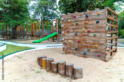 Wood panels wall playground with rock climbing simulation design at the garden background. Wooden planks playground with colorful stone cliff climbing model at the park
