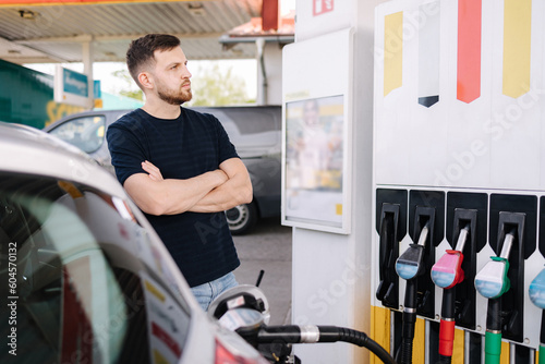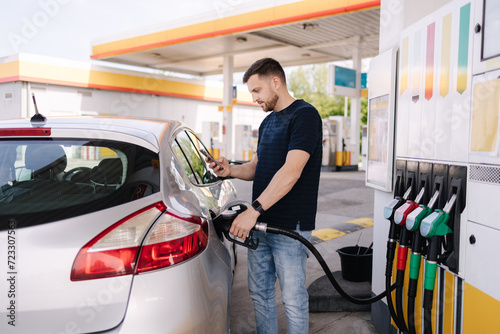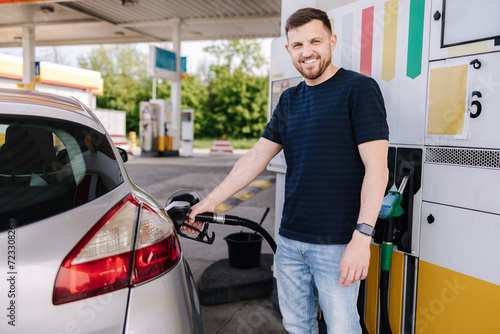 Handsome young man refueling car at gas station. Male filling diesel at gasoline fuel in car using a fuel nozzle. Petrol concept. Side view