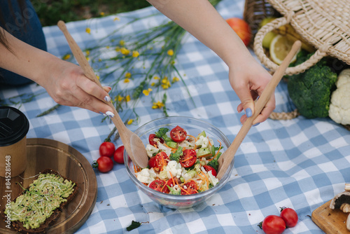 Woman mixes vegan salad on picnic outside. Vegan food concept
