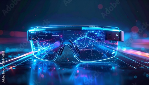 "Abstract concept of AR smart glasses technology in the future, light trails and holographic UI floating around sleek glasses, digital innovation theme, high detail, cinematic lighting"