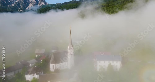 small village "Gosau" in Austria overflowed with fog and clouds. Drone aerial with mountains in the back