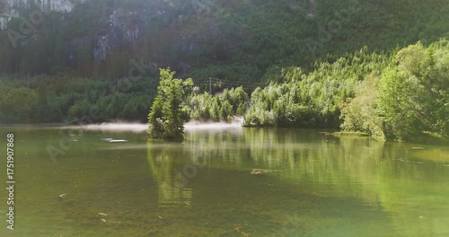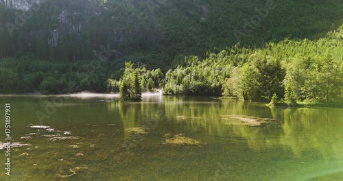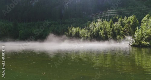 "Gosaub" little lake at "Gosau" Austria. CGreen lake with a forest and mountains in the back while having fog over it in the morning.