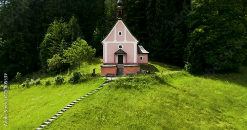"Kalvarienbergkirche" at "Gosau" Austria old pink church on a hill with mountains in the back