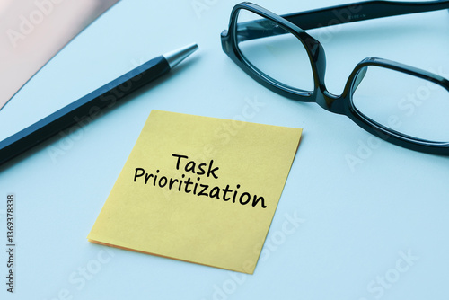 "Task Prioritzation" boldly written on a yellow colored piece of paper with a pen and eyeglasses on the white table. Business concept of work flow.