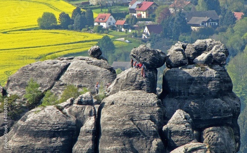 "Elbsandsteingebirge", Schrammsteine Saxony, Germany, Europe, panorama scene Schrammsteine in May blooming rape fields summer