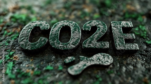 "CO2E" in bold green letters rests on a textured surface with a footprint symbol. Concept of carbon footprint and environmental awareness.