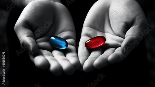 "Red pill or blue pill, which do you choose?" showing two open hands, one holding a red capsule, the other a blue one, generative ai