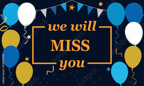 "We Will Miss You" Celebration Banner with Blue and Gold Balloons on Dark Blue Background