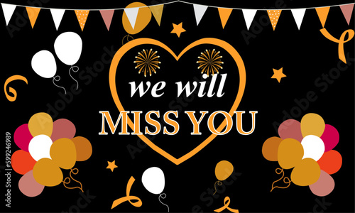 "We Will Miss You" Farewell Banner with Orange and White Balloons on Black Background