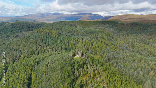 "Dramatic Drone Perspective of Creag Ruadh Historical Monument, Secluded Scottish Wilderness Site Surrounded by Ancient Woodland, Fyrish Estate, Ross-shire, United Kingdom.
