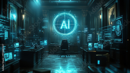 "AI" floating above a digital courtroom, representing the ethics of AI in law enforcement.