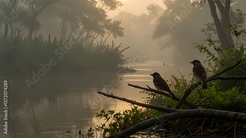 "Misty Serenity: River Landscape with Birds in Dense Foliage"