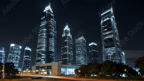 "Nighttime Radiance: Illuminated Cityscape with Modern Skyscrapers"