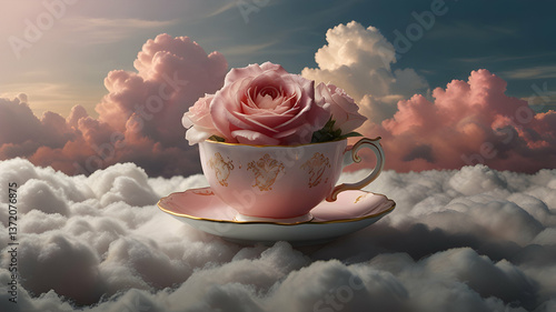 "Whimsical Beauty: Pink Rose in a Teacup Amidst Clouds"