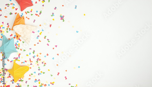 "Colorful birthday party decorations arranged on a white background, adding a festive and joyful atmosphere."