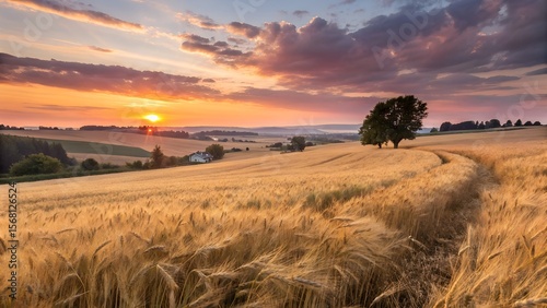 "Golden Wheat Field at Sunset – Peaceful Countryside Landscape Background"