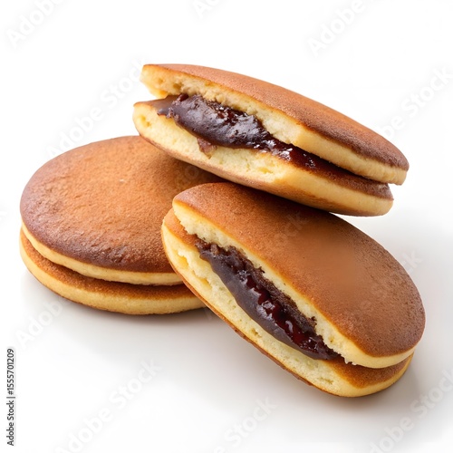 "Delicious dorayaki pancakes filled with sweet red bean paste on a white background."