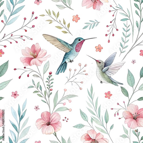 "Delicate hand-drawn illustration of a hummingbird surrounded by soft pink and white flowers with green foliage."