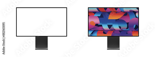 Apple Studio Display monitors with colorful and blank screens in silver and black stands