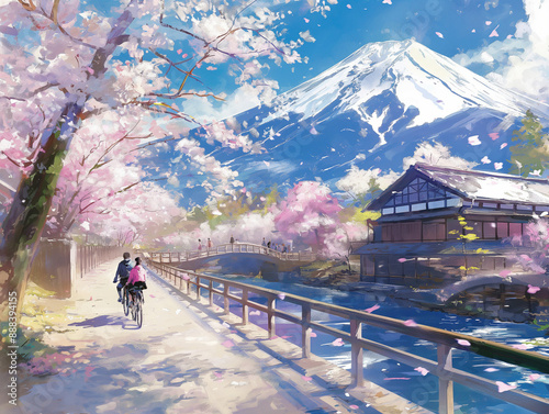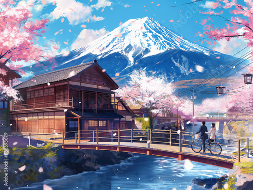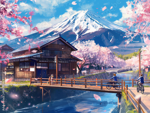 "Picturesque Japanese Scene with Mount Fuji and Cherry Blossoms"