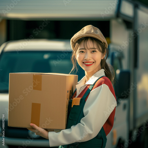 "Smiling Asian Delivery Girl with a Package"