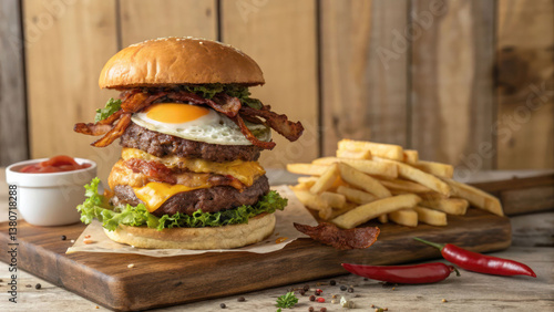 "A towering triple-patty burger with extra cheese, smoky bacon, and a fried egg, set against a rustic wooden background with a side of chili fries."