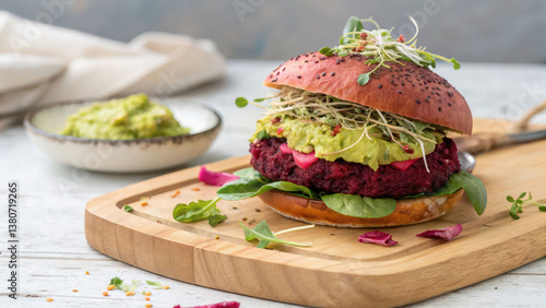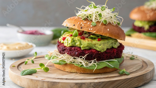 "A vibrant beetroot and black bean veggie burger with fresh sprouts, smashed avocado, and vegan cheese, plated on a light wooden serving tray."