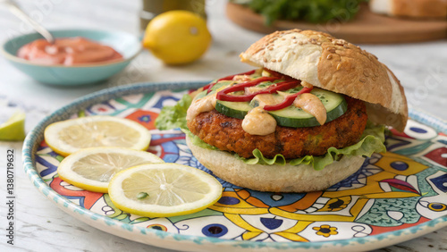 "A vibrant falafel burger with spicy harissa sauce, fresh cucumber slices, and tahini drizzle, placed on a Mediterranean-inspired mosaic plate with lemon wedges."