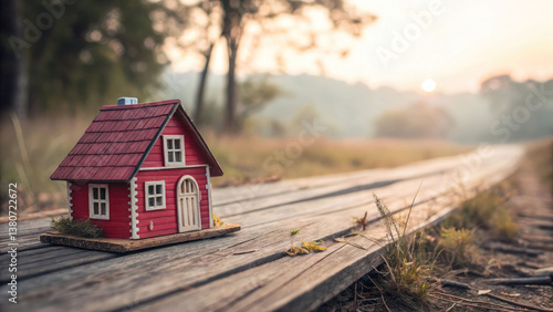 "Delicate red wooden house on a worn wooden surface, showcasing its quaint details with a dreamy, blurred background."