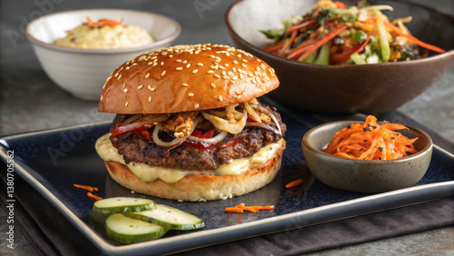 "A Korean BBQ burger with marinated bulgogi beef, spicy kimchi slaw, and sesame seed aioli, plated on a sleek ceramic dish with a side of pickled vegetables."