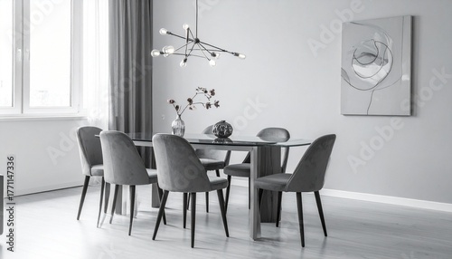 "Modern dining room with glass-top table, eight upholstered chairs in beige and gray, spherical chandelier, and minimalist decor with dried floral accents"