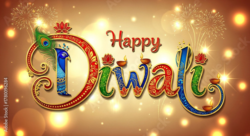 "colorful diwali celebration with peacock, fireworks, and lotus lamps