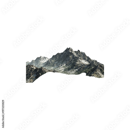 "Mountain range with snow-capped peaks and rugged terrain isolated on white background"