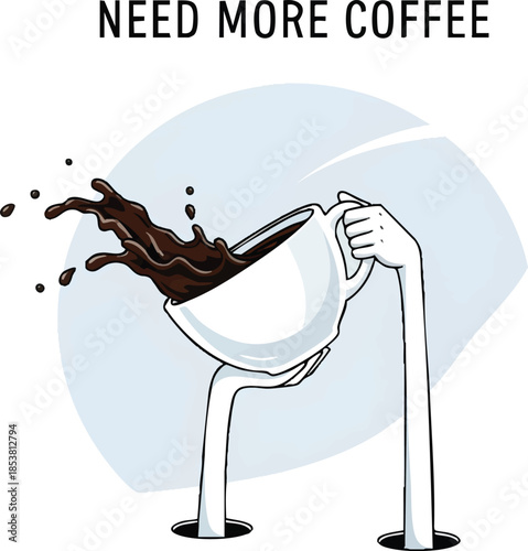 "Need More Coffee" Creative Illustration with Giant Splashing Coffee Mug
