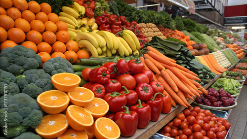 "Colorful assortment of fresh fruits and vegetables including oranges, tomatoes, peppers, bananas, broccoli, and carrots arranged in a vibrant display. "