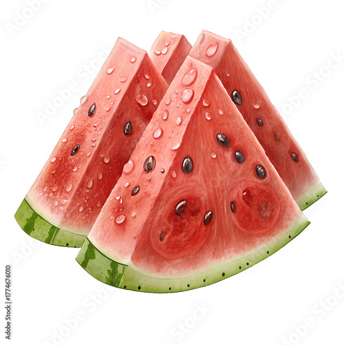 "Juicy Watermelon Cut into Triangular Slices – Vibrant Fresh Fruit with Water Droplets Isolated on White Background"