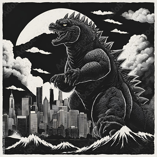 "The Monstrous Awakening: A Titan's Wrath Against the City Under the Full Moon" Under the eerie glow of a full moon, a monstrous titan rises from the depths, its colossal form looming over the sprawl