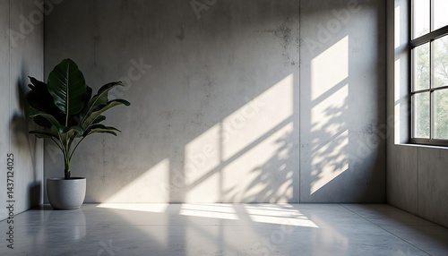 "Architectural fiddle leaf fig shadows on brutalist concrete High contrast black/white with visible aggregate texture Modern office environment designs"