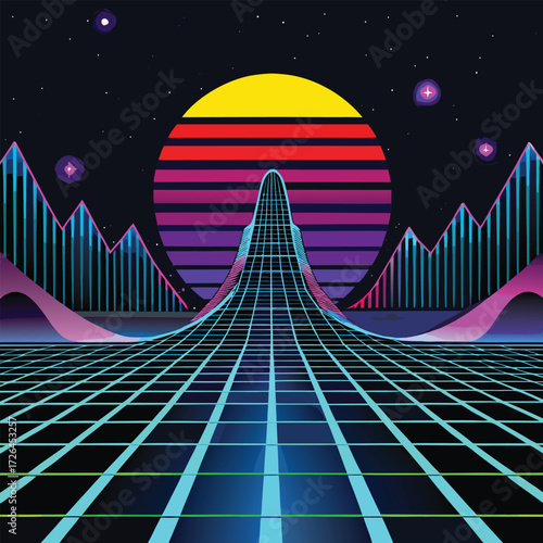 "Retro Futuristic Grid Road with Neon Mountains and Sunset"
