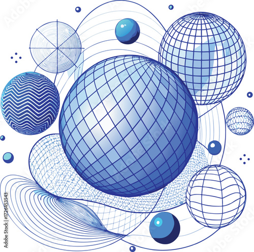 "Abstract Geometric Spheres with Flowing Mesh Lines – Blue Tech Background"
