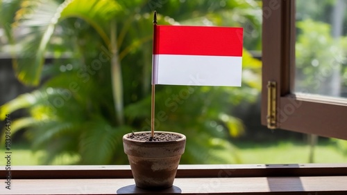 "Indonesia National Flag in Flower Pot with Green Nature – Jakarta, Merah Putih, Unity in Diversity & Pride"