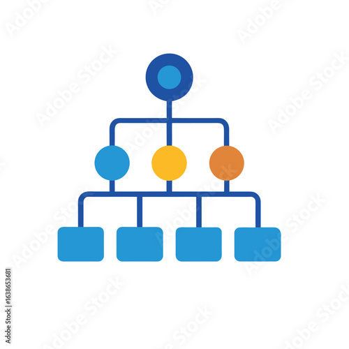 "Vector Organizational Chart Icon – Blue Circle at Top Linked to Three Mid-Level Nodes (Blue, Yellow, Orange), Each Connecting to Four Blue Rectangles – Flat Design Symbolizing Corporate Hierarchy, Te