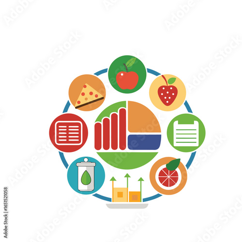 "Nutrition and Data Visualization Icon – Circular Composition Featuring Pizza Slice, Apple, Strawberry, Orange Slice, Leaf Bottle, Charts, and Documents Around Central Pie Chart – Flat Vector Illustra