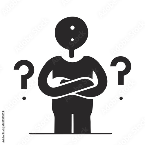 "Confused Human Icon – Minimalist Silhouette with Question Marks – Symbolizing Uncertainty, Decision-Making, and Thoughtful Inquiry – Black and White Vector for Editorial Use, UI/UX Feedback, Conceptu