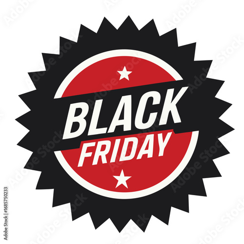 "Black Friday Promo Badge – Bold Red and Black Circular Graphic with Jagged Border, Slanted White Text, and Star Accents – Representing Seasonal Sales, Retail Discounts, and Shopping Events – Ideal fo