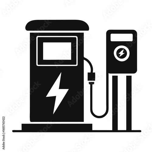 "Electric Vehicle Charging Station Icon – Black and White Vector Illustration Featuring Plug-In Unit, Display Screen, and Lightning Bolt Symbols – Representing Sustainable Transportation, Eco-Friendly