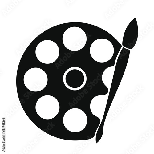 "Artist Palette and Paintbrush Icon – Black Silhouette Vector Illustration Featuring Eight Paint Wells and Diagonal Brush – Symbolizing Creativity, Artistic Expression, and Visual Design – Ideal for U