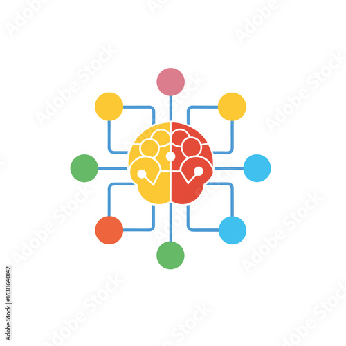 "Stylized Brain Network Icon – Vector Illustration of a Divided Brain with Red and Yellow Halves, Surrounded by Colorful Nodes Connected by Blue Lines – Symbol for Artificial Intelligence, Neural Netw