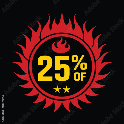 "25% Discount Promo Icon – Bold Black and Red Graphic with Flame Motif and Yellow Text – Featuring Circular Emblem, Stars, and Central Offer Message – Ideal for Marketing, Advertising, E-Commerce, and