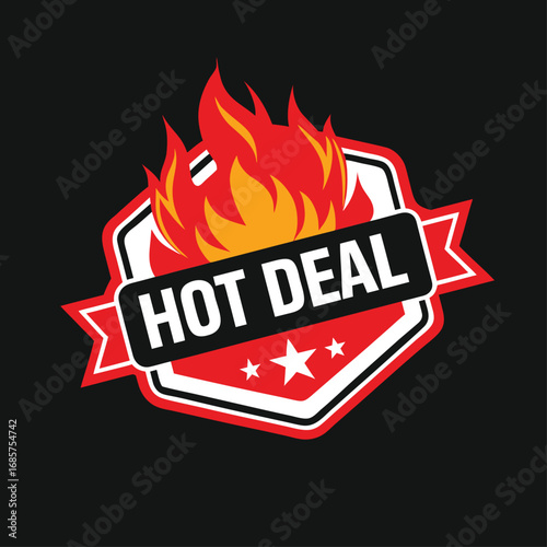 "Hot Deal Promo Badge – Stylized Flame with Bold Black Banner and White Text, Red Ribbon Accents, Hexagonal Frame, and Star Details – Ideal for Flash Sales, Urgent Offers, Retail Promotions, and E-Com